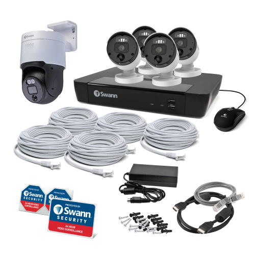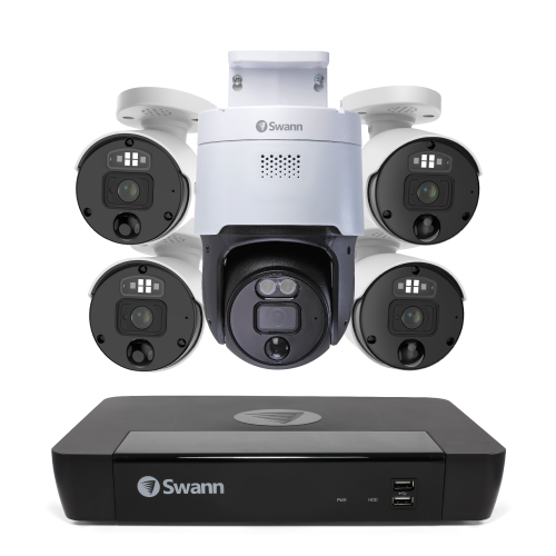 Enhance your security with Swann’s 5 Camera 8 Channel 4K Ultra HD Professional NVR Security System. This system delivers stunning 4K resolution, True Detect™ heat and motion-sensing technology, and Night2Day™ color night vision. The package includes four 4K bullet cameras and one pan-tilt camera, all equipped with spotlights, sirens, and sensor warning lights for enhanced deterrence. The 2TB HDD provides extensive storage. Manage and access footage remotely via the Swann Security App.