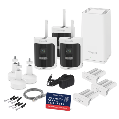The AllSecure650 4K Wireless Security Kit has three 100% wire-free cameras you can set up in minutes. The cameras feature long-lasting rechargeable batteries, spotlights, sirens, 2-way talk and more, all controllable through the Swann Security app. There's also a spare battery that charges in the Power Hub for easy swapping with no downtime and provides backup power to the Hub. It’s security made smarter and fee free.