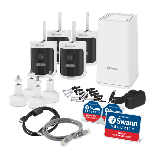The AllSecure650 2K Wireless Security Kit has four 100% wire-free cameras you can set up in minutes and up to 2 years of recording to the Power Hub. The cameras feature long-lasting rechargeable batteries, spotlights, sirens, 2-way talk and more, all controllable through the Swann Security app. There's also a spare battery that charges in the Power Hub for easy swapping with no downtime and provides backup power to the Hub. It's security made smarter and fee free.