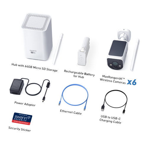Swann’s MaxRanger4K Solar Security System offers the longest range and strongest wireless signal with 20x the coverage of other Wi-Fi security systems and the ability to mount each of the 4K day/night Cameras anywhere outside up to 2,000ft/600m (in the open air) and 650ft/200m (for typical use) from the Hub. The 6 x Cameras have built-in solar panels, sensor lights, sirens, 2-way talk, color night vision, True Detect+ for heat, motion, people and vehicle-triggered alerts and recording to the Hub’s 64GB local memory (to store up to 6 months rolling clips) with no monthly fees. View and control on the Swann Security app. Perfect for large homes, small business, rural properties, farms and more. It’s longer, stronger and more reliable wireless security.